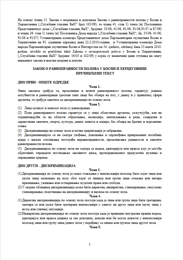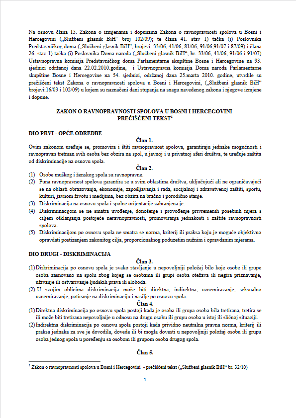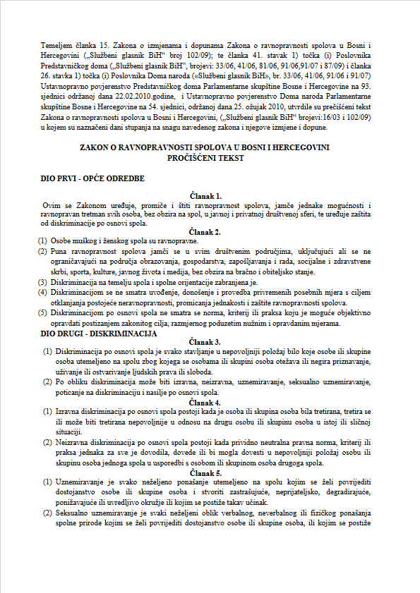 | link Zakon o ravnopravnosti spolova u BIH, bosanski jezik |